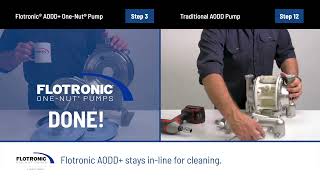 See how a Flotronic® AODD+ pump, with its unique One-Nut® design, greatly accelerates cleaning and maintenance times compared to a traditional AODD pump. Watch this video of a head-to-head comparison of a Flotronic AODD+ pump vs. a traditional double-diaphragm pump and see the difference for yourself. Watch as a worker disassembles a Flotronic AODD+ pump in just three steps while disassembling a traditional air-operated double-diaphragm pump requires 18 steps. There is plenty of time for the first worker to move on to other maintenance or cleaning tasks. Also, there is only one large nut to keep track of, compared to more than 50 parts to keep track of with a traditional pump. That represents 50 fewer opportunities for a small part to be lost into the process fluid. What’s more, a Flotronic AODD+ pump stays in-line for cleaning, while a traditional double-diaphragm pump requires disconnection from the line. Not all hygienic diaphragm pumps are created equal. That’s why we say: You may have tried an AODD, but that’s nothing like a Flotronic AODD+!
